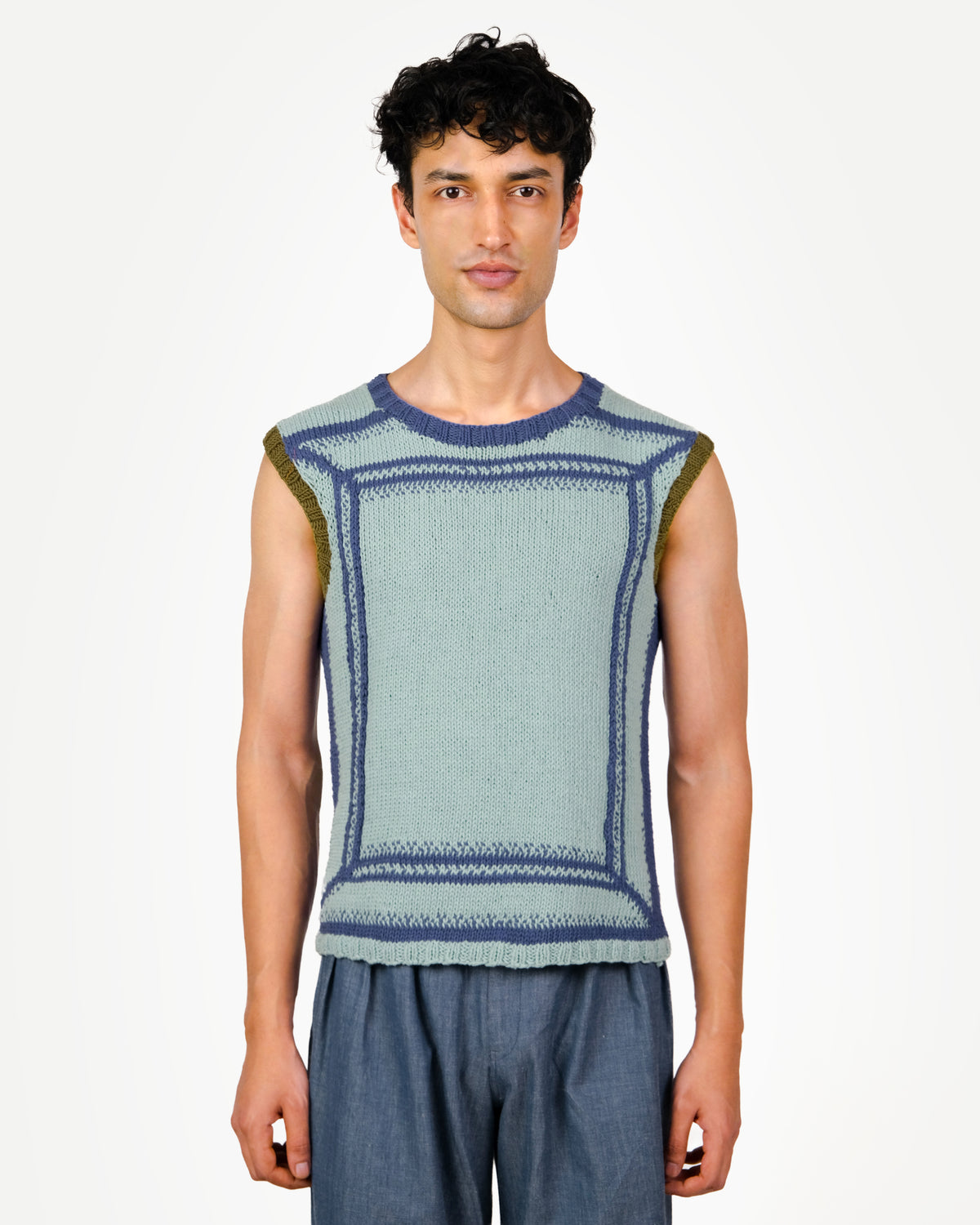 This hand-knitted tonal teal sweater vest features a moulding-inspired motif from 17th-century Raagmala paintings, knit in intarsia with kantha shading. Olive-green armholes add subtle contrast.