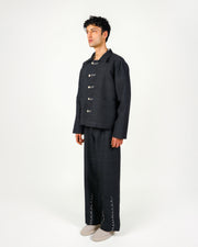 These trousers are crafted from charcoal handwoven khadi silk, featuring white doodle hand-embroidery along the hem and belt loops. The design is inspired by the winter season depicted in Raagmala miniature paintings.