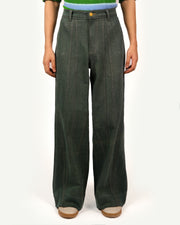These trousers are crafted from green washed denim, composed of triangular panels stitched together seamlessly. The design draws inspiration from architectural details featured in 17th-century Indian miniature paintings.